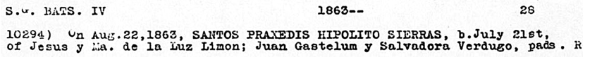 - On August 22, 1863, Santos Praxedis Hipolito Sierras was baptized. He was born on July 21, 1863, to Jesus [Sierra] and Maria de la Luz Limon. The godparents were Juan Gastelum and Salvadora Verdugo.