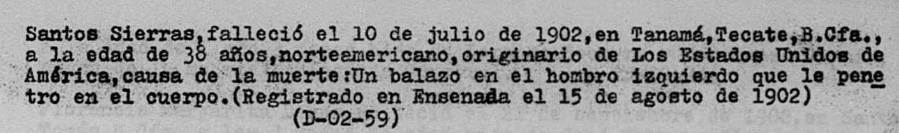 - Santos Sierras passed away on July 10, 1902, in Tanamá, Tecate, Baja California, at the age of 38 years. He was an American, originally from the United States of America. Cause of death: A gunshot wound to the left shoulder that penetrated his body.