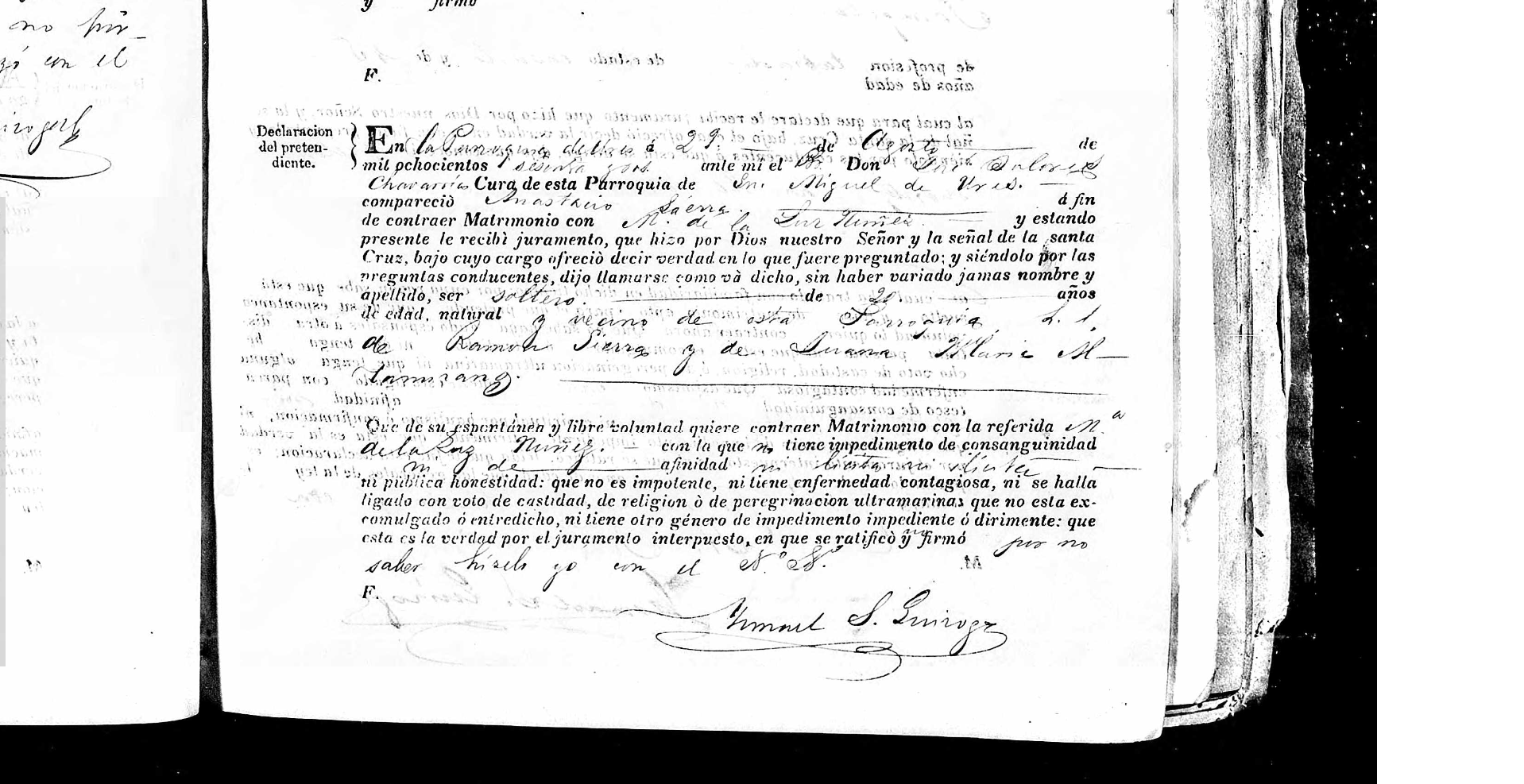 - In the parish of this town of San Miguel de Horcasitas, on the 29th day of the month of August in the year 1862, before me, Brother Francisco Salcido, Parish Priest of this Parish of San Miguel de Horcasitas, appeared Mr. Anastacio Sierra, with the intent of contracting marriage with María de la Luz Núñez. Being present, I received his oath, which he made by God our Lord and the sign of the holy cross, under which he promised to tell the truth in whatever he was asked. In response to the relevant questions, he stated his name as given above, that he had never changed his name or surname, that he was a single man of 20 years of age, a native of this jurisdiction, the legitimate son of Ramón Sierra and Juana Maria Castillo, and that of his own free and spontaneous will, he wished to marry the aforementioned María de la Luz Núñez. He declared that he had no impediment of consanguinity or public honesty; that he was not impotent, nor did he suffer from any contagious disease; that he was not bound by vows of chastity, religion, or overseas pilgrimage; that he was not excommunicated or under interdiction, nor did he have any other type of impediment preventing or nullifying the marriage. He affirmed this truth under oath, which he ratified and signed.